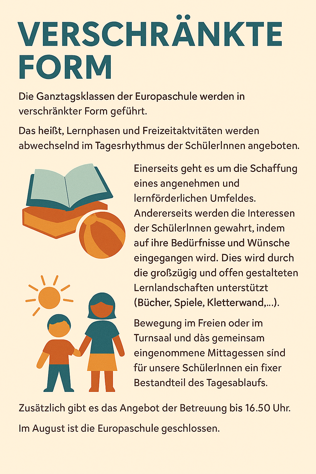 Damit Schule gut zum Familienalltag passt, bieten wir zwei unterschiedliche Ganztagsmodelle an: die verschränkte Form und die getrennte Form. Beide verbinden Lernen, Betreuung und Freizeit auf sinnvolle Weise – je nach Bedarf entweder über den ganzen Tag verteilt oder mit Unterricht am Vormittag und optionaler Nachmittagsbetreuung.