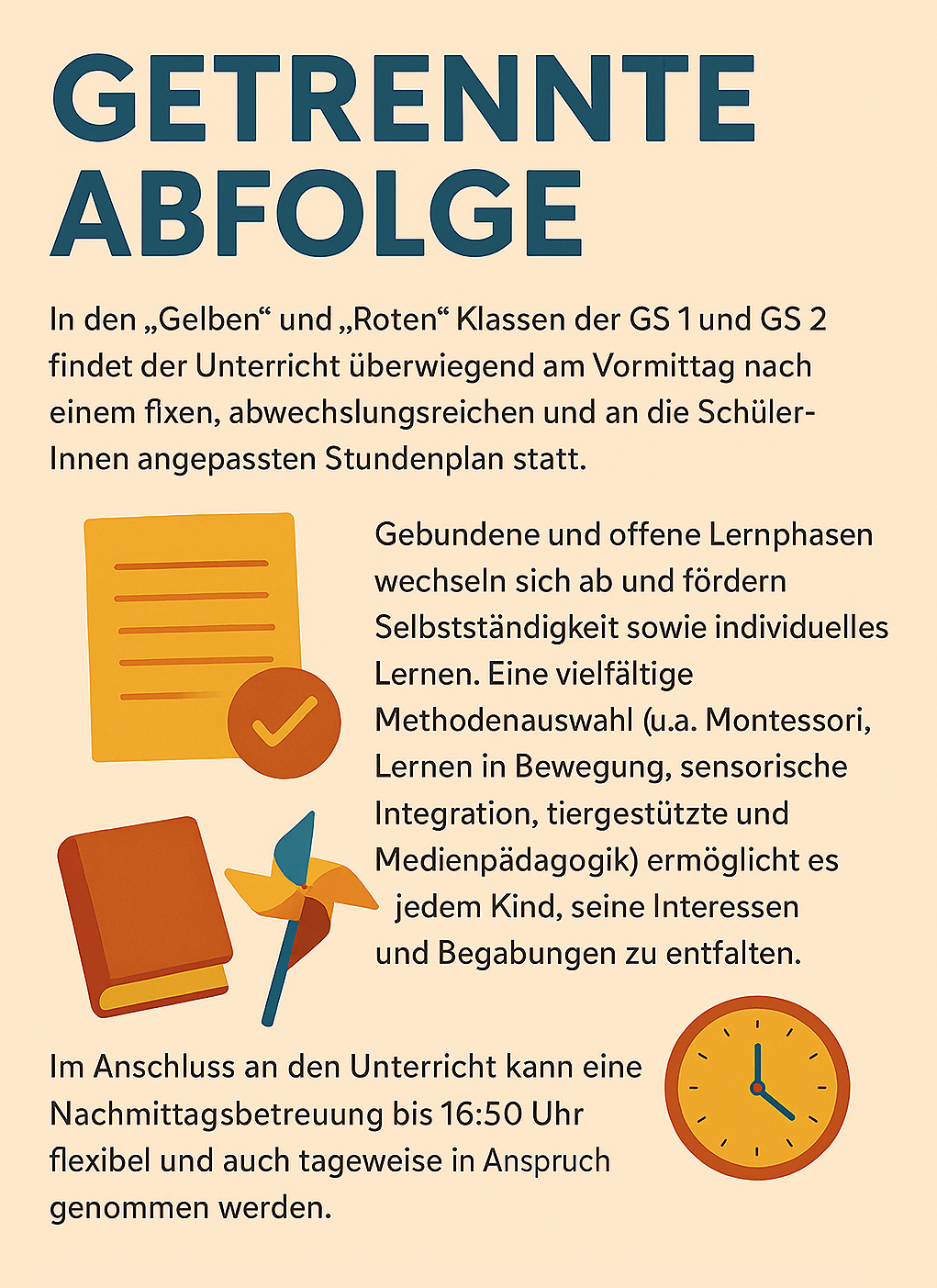 Während bei der verschränkten Form Lern‑ und Freizeitphasen über den ganzen Tag verteilt sind, findet bei der getrennten Form der Unterricht überwiegend am Vormittag statt, ergänzt durch eine flexible Nachmittagsbetreuung. So können Familien die Schulform wählen, die am besten zu ihrem Alltag passt.