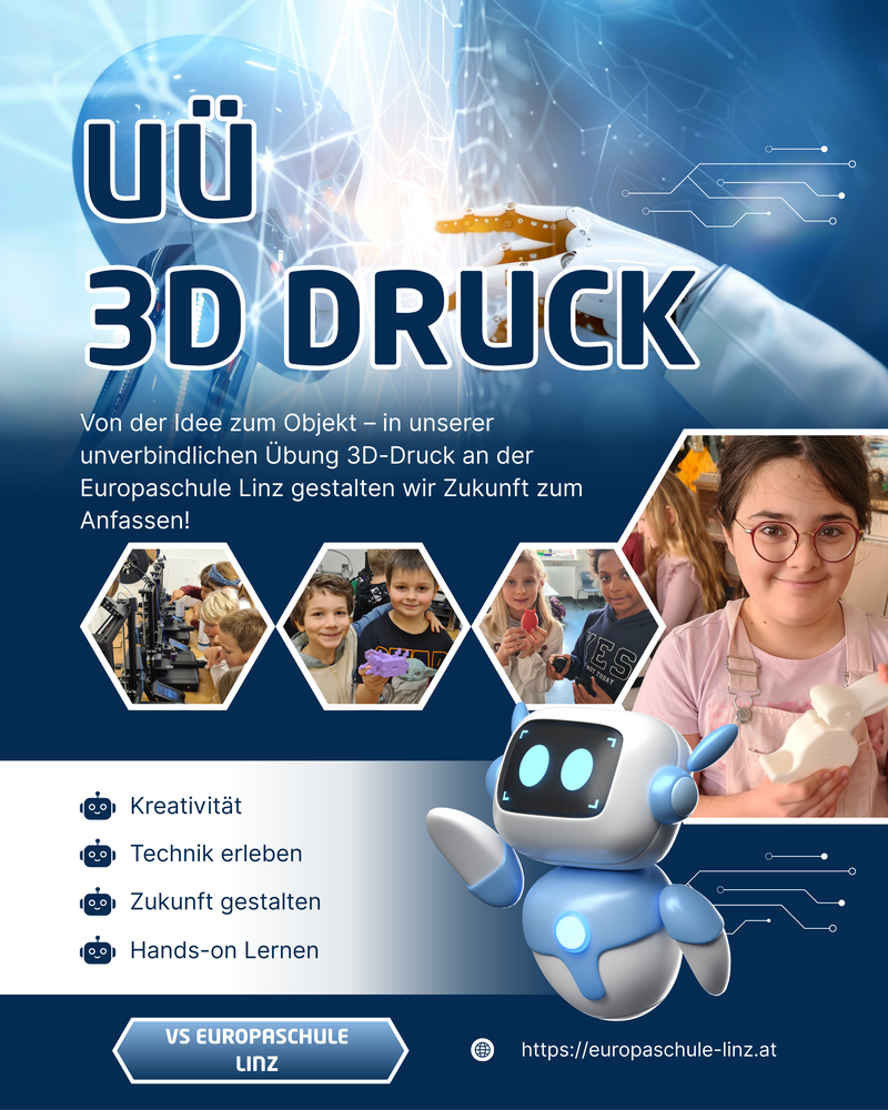 Im Rahmen der unverbindlichen Übung 3D-Druck tauchen interessierte SchülerInnen der Europaschule Linz in die Welt der digitalen Gestaltung und Fertigung ein. Mit modernen 3D-Druckern und entsprechender Software lernen sie, eigene Modelle zu entwerfen, zu optimieren und schließlich real auszudrucken.